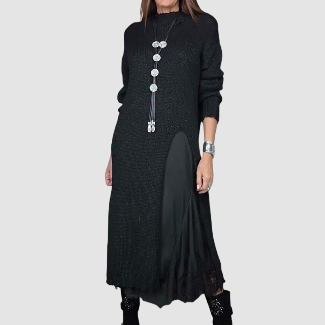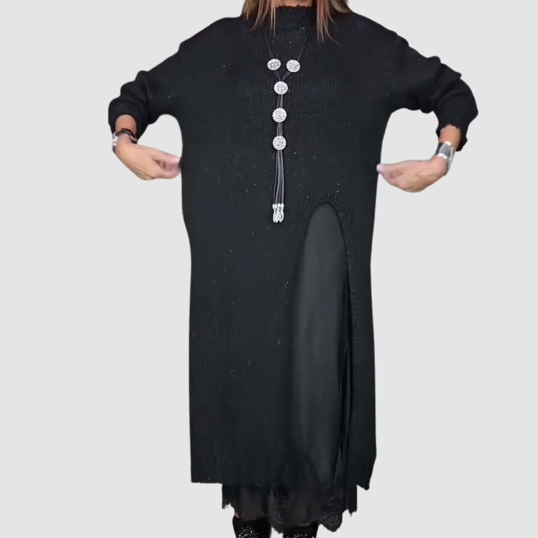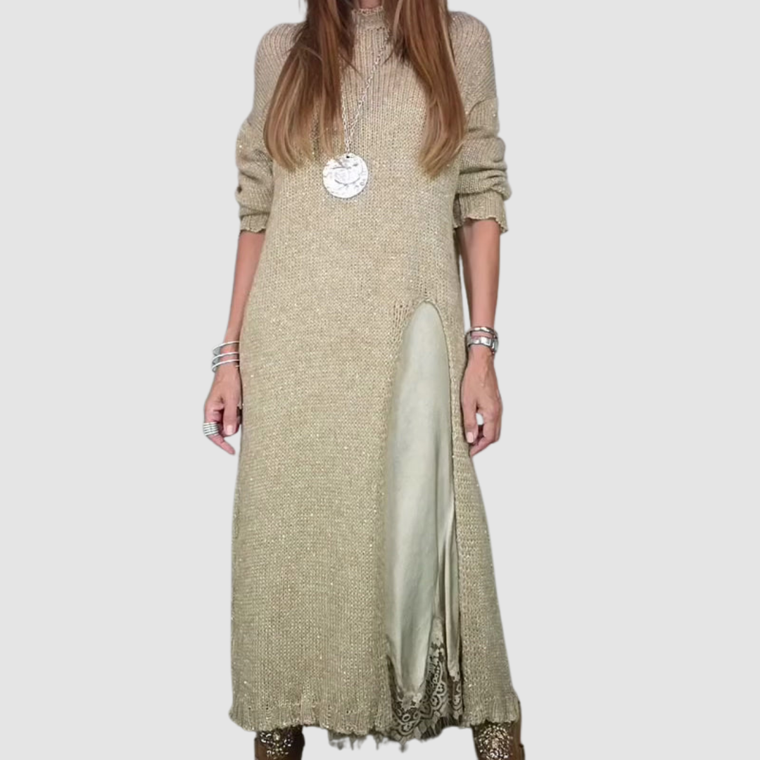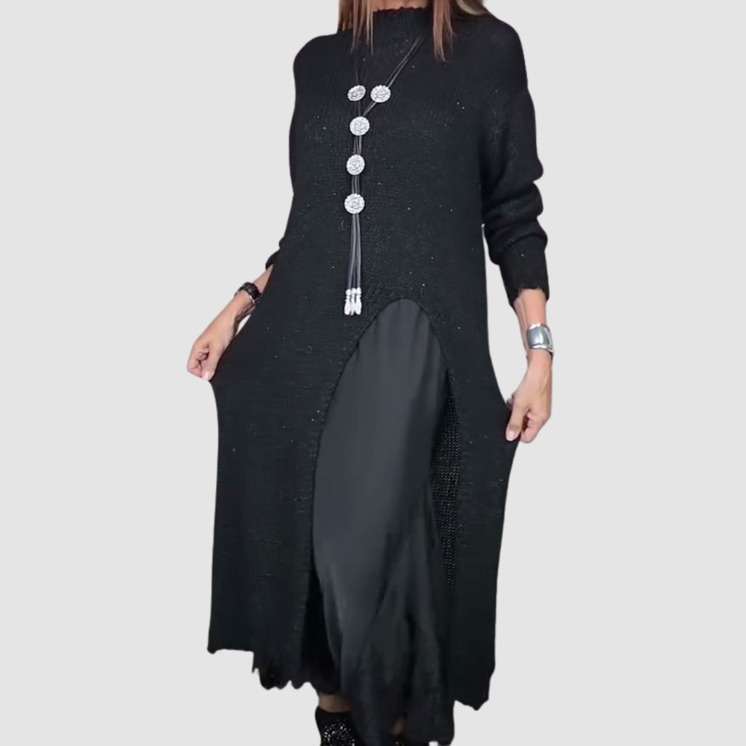 • Elegant Layered Design: The long, soft pullover drapes smoothly over a flowing spaghetti-strap dress for a chic, effortless ensemble.